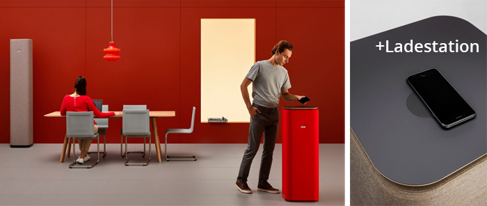 Die elegante schlanke Silhouette in vier verschiedenen Größen fügt sich in alle Arten von Innenräumen ein und ist einfach zu versetzen. Auf den 1m-Tower kann optional eine Induktions-Ladestation integriert werden.