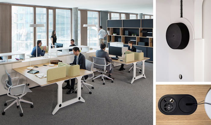 Kabelauslässe kombiniert mit einer Netbox und Kabelwannen unterhalb der Tischplatten erlauben eine komfortable Tischelektrifizierung.